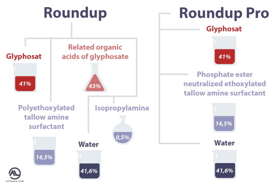 The United States Department of Agriculture, in their herbicide information profile, has noted the contents of Roundup make up glyphosate (41%), related organic acids of glyphosate (1.5%), isopropylamine (0.5%), polyethoxylated tallow amine surfactant (15.4%), and water (41.6%), and the other variant Roundup Pro contains phosphate ester neutralized ethoxylated tallow amine surfactant (14.5%) and water (44.5%) in addition to glyphosate (41%).